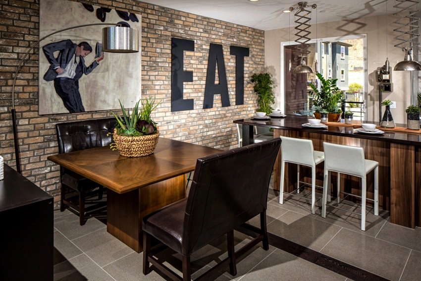 Приём комбинирования полотен в помещениях весьма удачен. С его помощью можно выделить разные функциональные зоны, придав интерьеру оригинальность. Популярный способ зонирования – выделение обеденной зоны обоями с рисунком в сочетании с однотонными стенами на остальной площади.