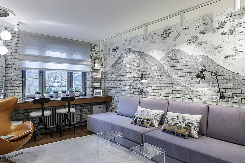 Для оформления гостиной в стиле лофт подойдут фотообои с имитацией кирпичной или каменной кладки. Также красиво будут смотреться варианты с изображением карты мира.
