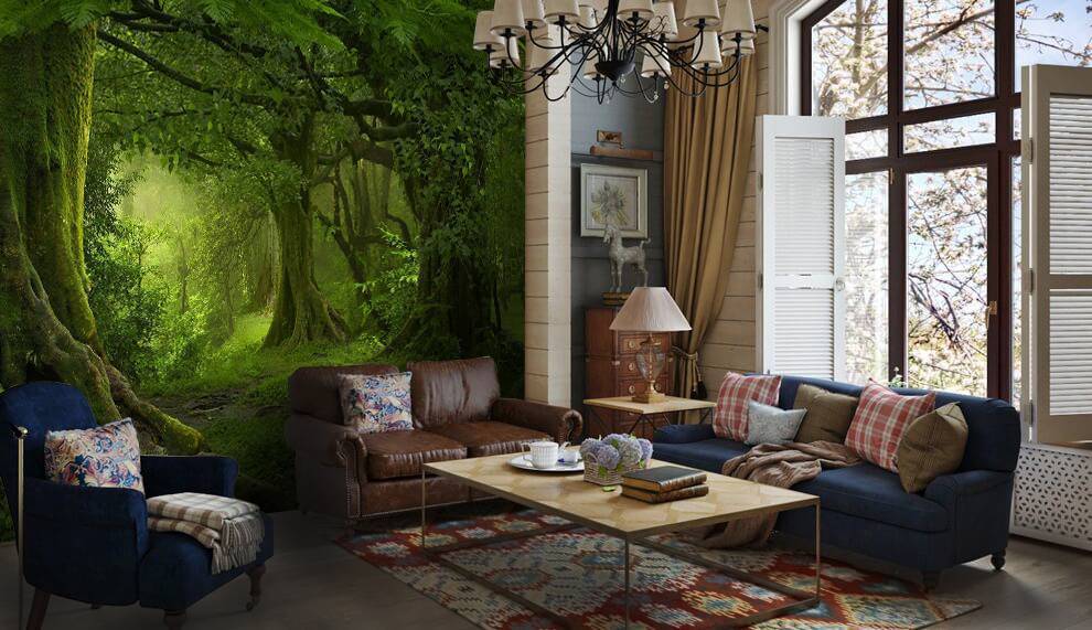 Не стоит забывать и про стиль помещения. Так, например, стиль хай тек в гостиной не сможет гармонировать с изображением макового или ромашкового поля на одной из стен. Необычные цветы или березовая роща прекрасно дополнять стиль кантри.