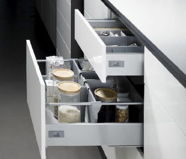 - Конструкции металл-бокс – выдвижная мебельная фурнитура: направляющие двигаются за счет роликов. Основным отличием является наличие дополнительных металлических боковых стенок, которые способствуют повышению нагрузки на механизм. Ящики, оснащенные фурнитурой металл-бокс можно нагружать до 30кг. По желанию заказчика выдвижные механизмы подобной конструкции можно оснащать доводчиками.