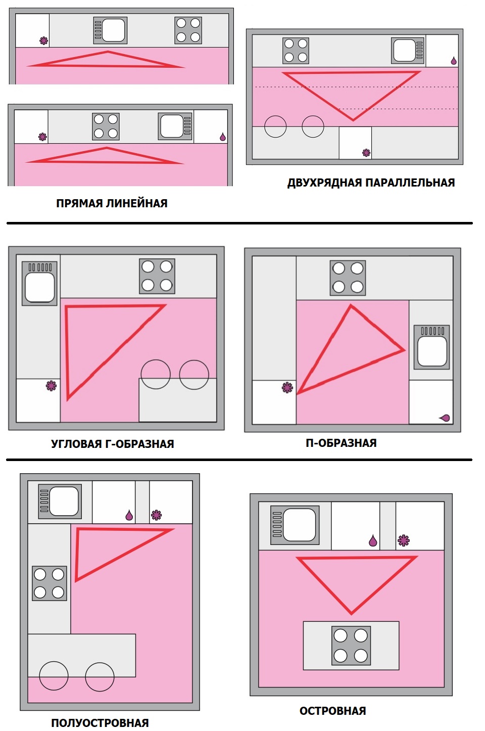 Очень уютный, удобный и функциональный способ размещения мебели и техники в виде буквы П подойдет для комнат среднего и большого размеров. В эту компоновку идеально вписываются три основных элемента треугольника – по одному прибору на каждую сторону.