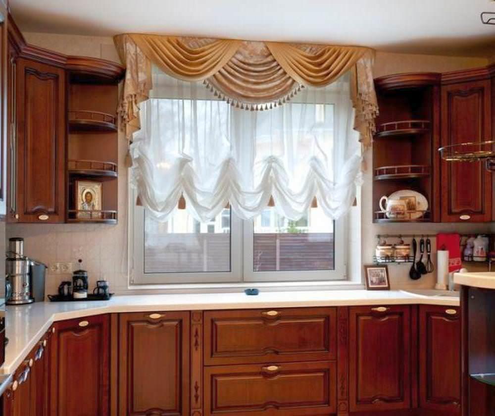 Некоторые модели штор для кухни предполагают драпировку, например, французская штора.