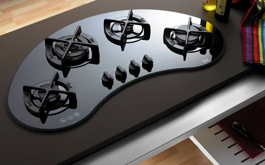 - Газ под стеклом – а вот это уже настоящий футуризм. Особенность подобных моделей заключаются в том, что конфорки спрятаны под рабочей поверхностью из стеклокерамики. Смотрится просто потрясающе.