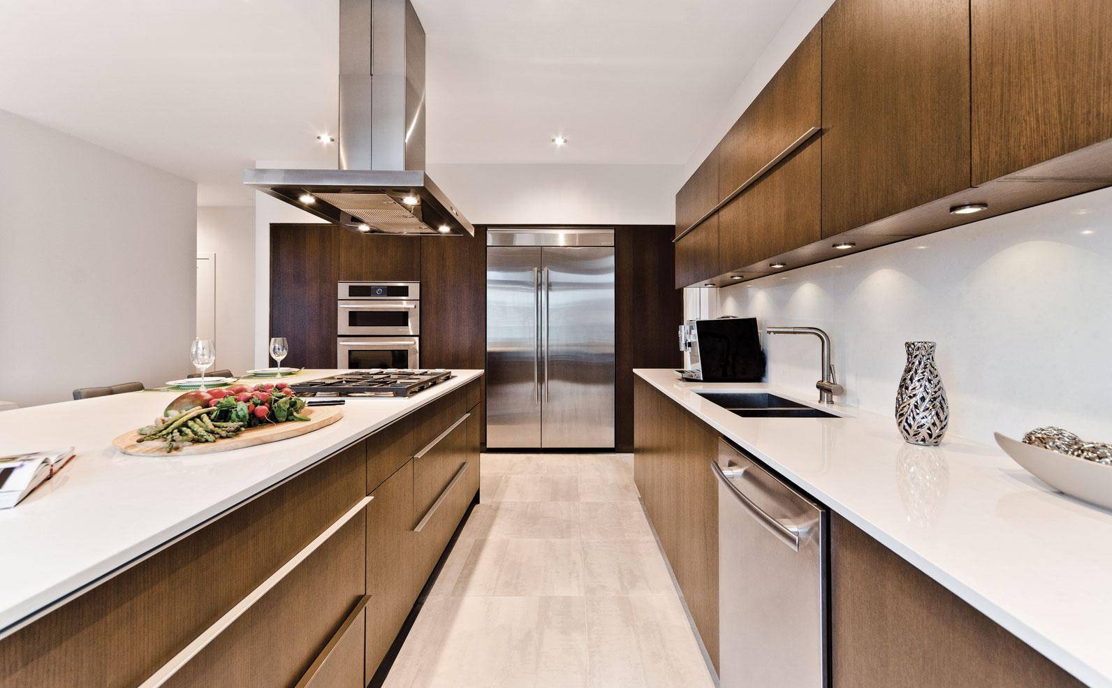 При этом стол может выполнять функцию дополнительной рабочей поверхности. В просторных помещениях маленькую сторону оформляют в виде барной стойки, хотя мода на подобный вариант планировки идет на спад.