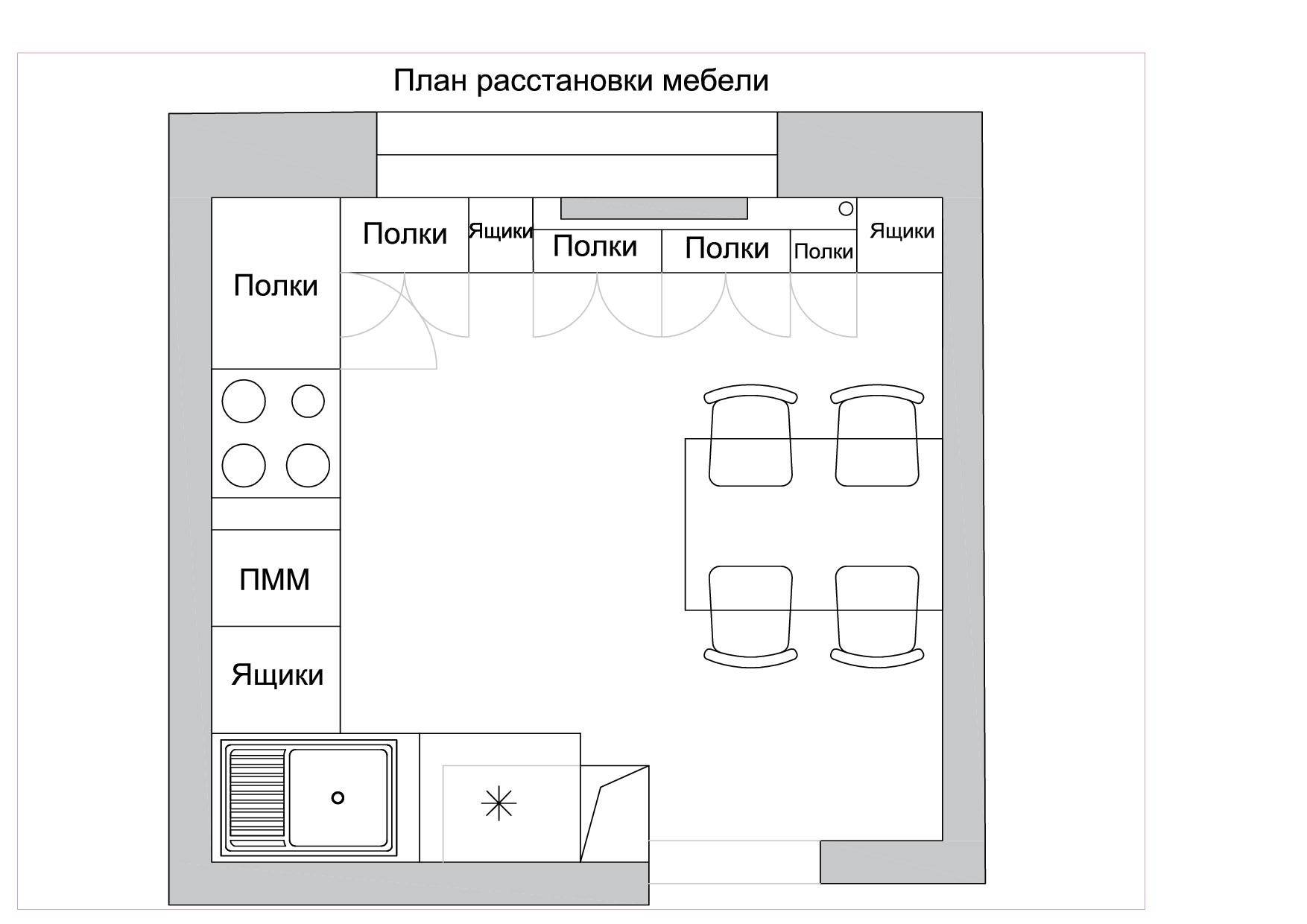 Исходя из площади и формы кухни, а также иных факторов (наличии/отсутствии оконного проема и т.д.), следует перед тем, как покупать, или заказывать технику и гарнитур, составить план расстановки.