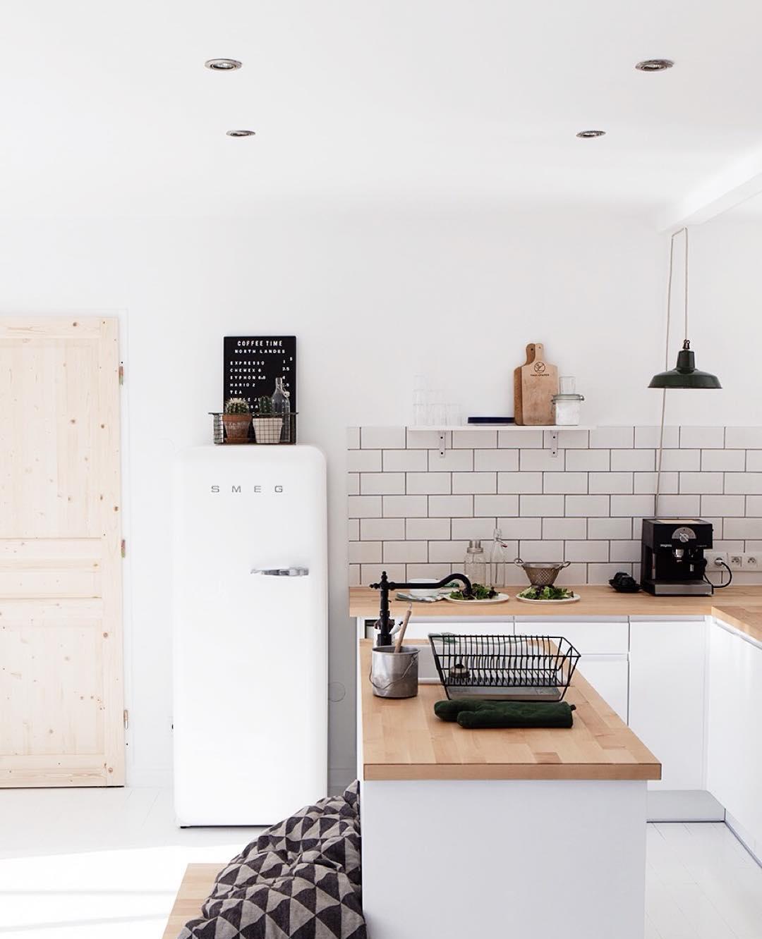 Аутентичный скандинавский стиль. Здесь используются деревянные поверхности и белый цвет отделки. Для кухонной зоны характерны вместо навесных шкафов открытые полки, что дает ощущение легкости и незагруженности пространства.