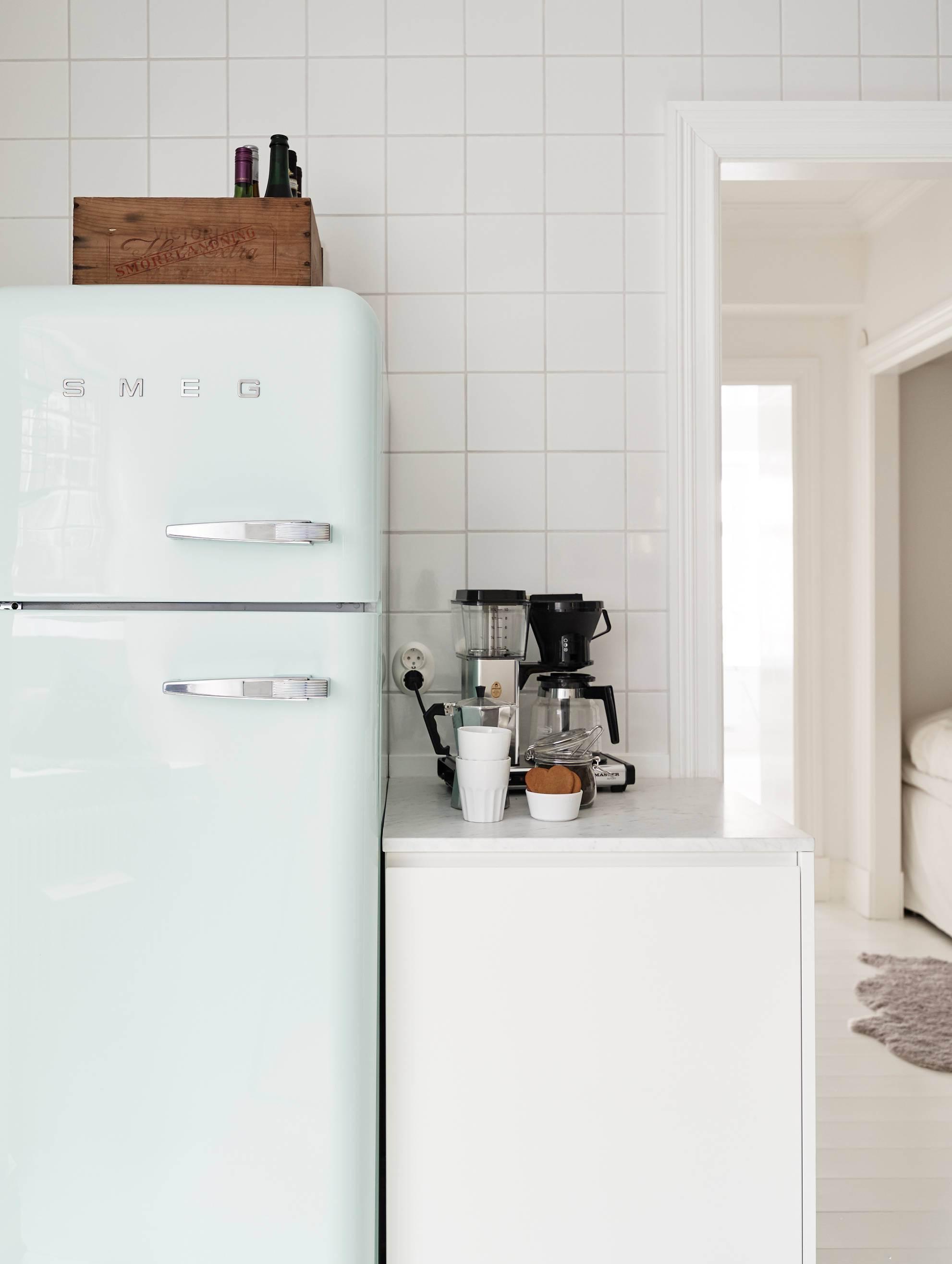 Холодильник за пределами кухни должен соответствовать стилю обоих помещений, чтобы сохранялась гармония между зонами