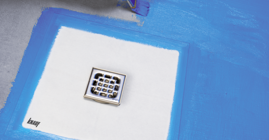- Вокруг сливного трапа нанесите гидроизоляцию КНАУФ-Флэхендихт и уложите на неё напольную гидроизоляционную манжету КНАУФ. После приглаживания манжеты шпателем по месту вырежьте канцелярским ножом отверстие по форме трапа (круглое, прямоугольное и т.п. в зависимости от выбранного трапа).
