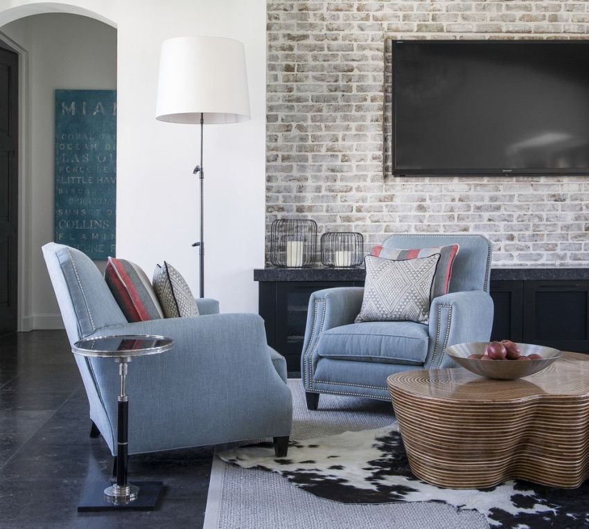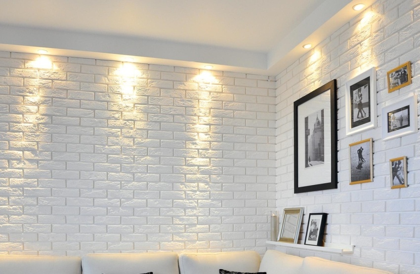 Стены гостиной облицованы плиткой из гипса