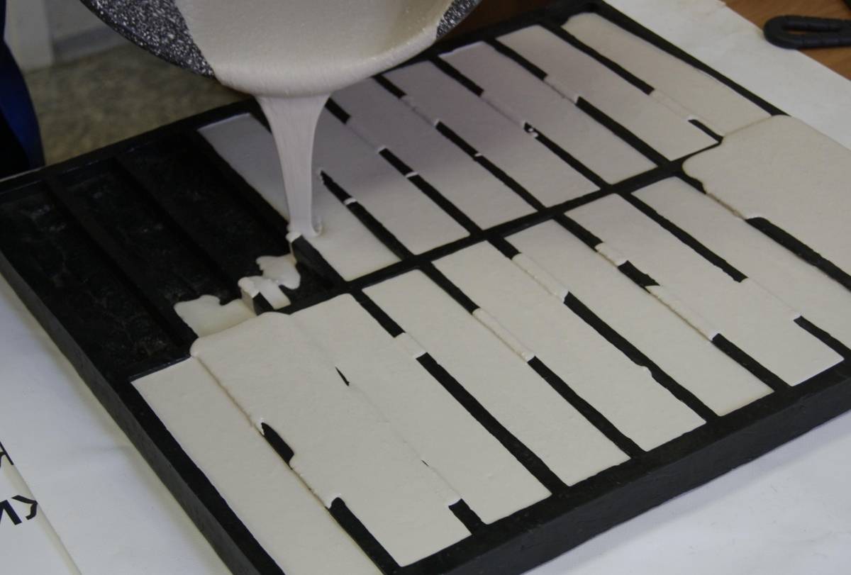 Для начала в резервуаре смешивается сухая гипсовая смесь и вода. Нужно помнить, что количество готовой смеси должно быть идентично количеству заполненных форм, что есть в наличии. Иначе говоря, недопустимо, чтобы приготовленный гипс оставался длительное время без формы в резервуаре. Приготовляйте столько, сколько войдет за один раз