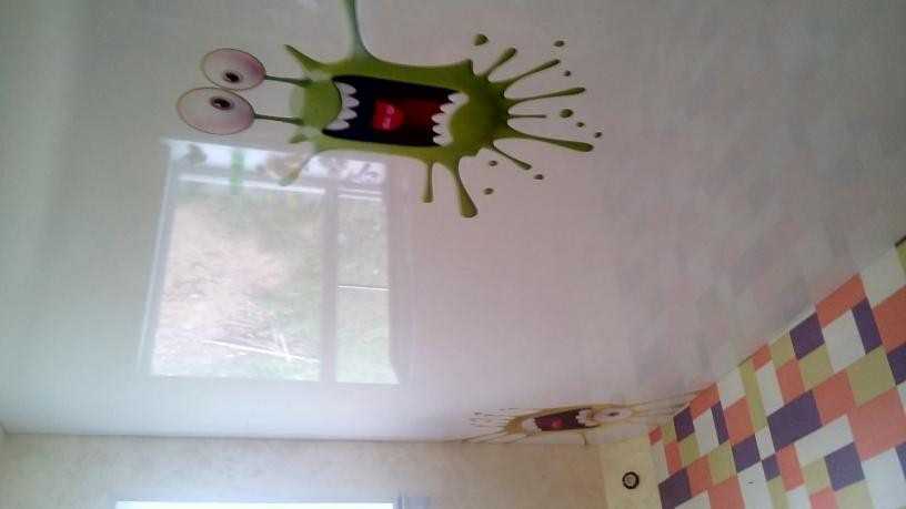 Сочетание подсветки с фотопечатью может создать и объемные разводы цветного дыма на потолке — красиво и необычно. Несомненно, вашим детям понравится такой оригинальный узор.