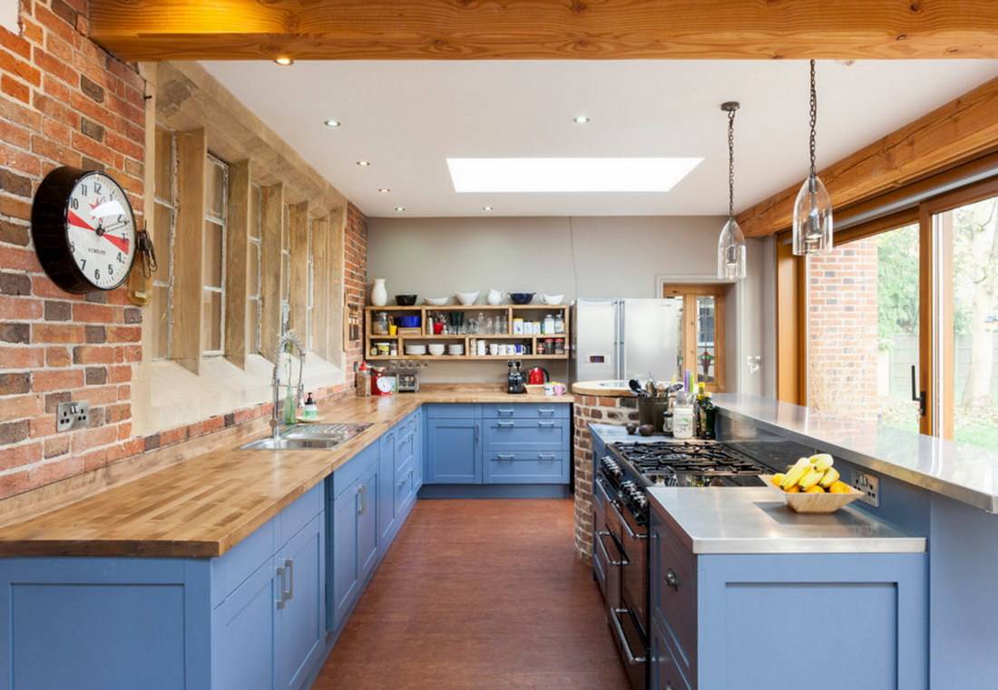 Являясь в какой-то мере оттенком коричневого, дерево является одним из лучших компаньонов синевы. Такое сочетание может использоваться в кухнях любого стиля и исполнения: дерево будет хорошо смотреться в качестве практически любой детали интерьера.