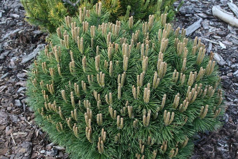 Pinus mugo mughus — что в длину, что в ширину вырастает примерно одинаковых размеров (до 2-3 м), ежегодно прибавляется около 10 см. Иглы посажены густо и собраны в пучки по 2 штуки, каждая из которых достигает 4 см. Шишки начинают образовываться только спустя 6 лет. Во время сильной жары нуждается в регулярном поливе. Растет в любой почве, не привередлива.
