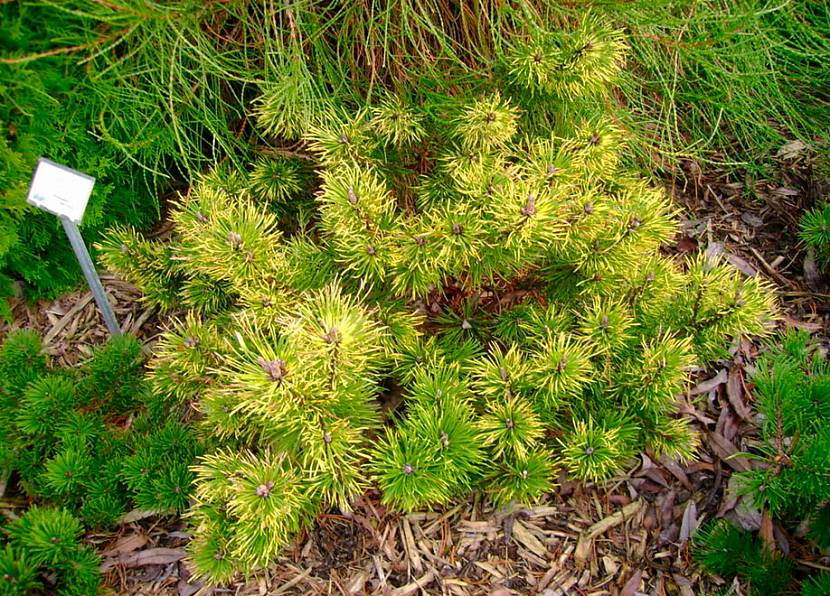 Является карликовым сортом. Кустарник растет на длинном стволе, но сам он невелик и его высота составляет около 0,5 м. Такую горную сосну чаще выращивают именно в домашних условиях, в цветочном горшке. Ежегодный прирост составляет примерно 3 см. Любит солнце и совершенно не переносит чрезмерной влаги в почве.