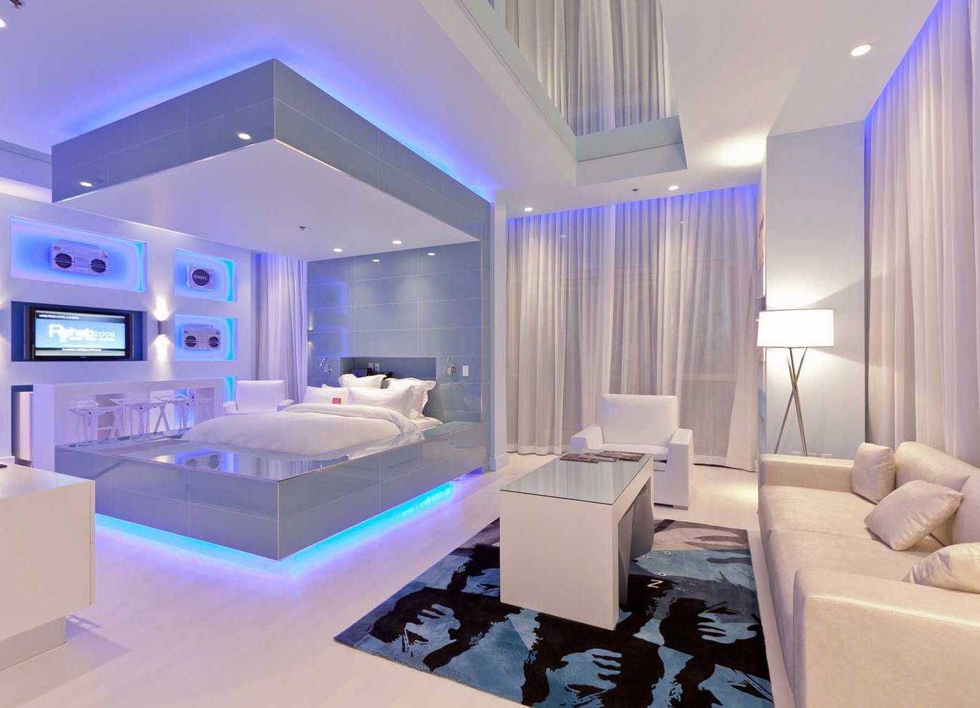 В белой комнате предусмотрена неоновая подсветка большой кровати областях пола и потолка