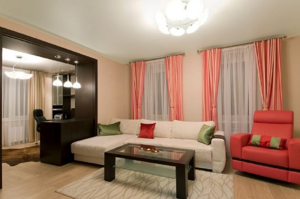 Тем не менее, при выборе занавесей придется учитывать особенности нового помещения, которое получилось в результате объединения: количество окон в нем увеличилось.
