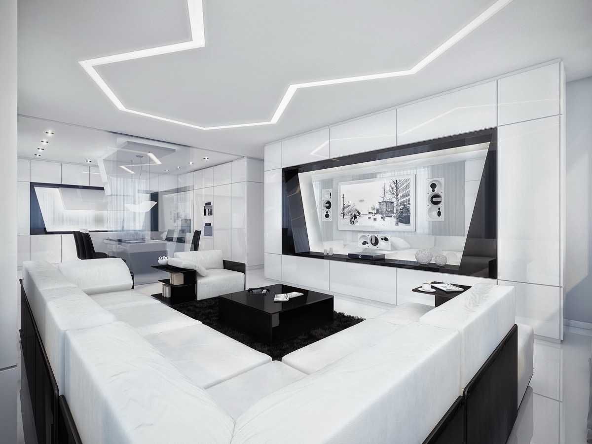 3.3 Стиль хай-тек подразумевает множество ультрасовременных деталей, в том числе – высокотехнологичных элементов. Он может включать мотив космического футуризма или минималистичный код. Его характерные черты – серая гамма, глянцевые и металлизированные гладкие фасады, холодное LED-освещение, простые очертания мебели. На фото представлен стильный чёрно-белый дизайн гостиной с призмой в качестве ключевого элемента. Чтобы комната не казалась скучной, дизайнер использован ломаный контур освещения и необычную детальную картину в центре.