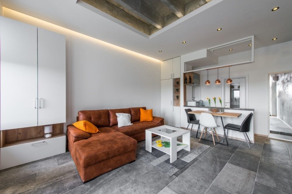 Белые стены и мебель с простым силуэтом могут подчеркнуть просторность гостиной, а чёрные акценты добавят лоска. Если нужно сделать лофт более камерным, подумайте о графитовых или чёрных потолках и стенах.