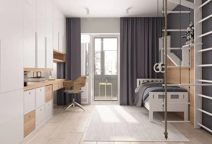 Скандинавский. Стиль подходит для комнат со скромной квадратурой и недостатком естественного освещения. Его отличительная черта — использование светло-серых оттенков в сочетании с доминантным белым и дополнительными яркими вкраплениями. В комнату для мальчика выбирают текстиль насыщенных тонов: коричневый ковер, узорчатые бело-голубые шторы, синий плед. Детская в желто серых тонах чаще оформляется для девочки.
