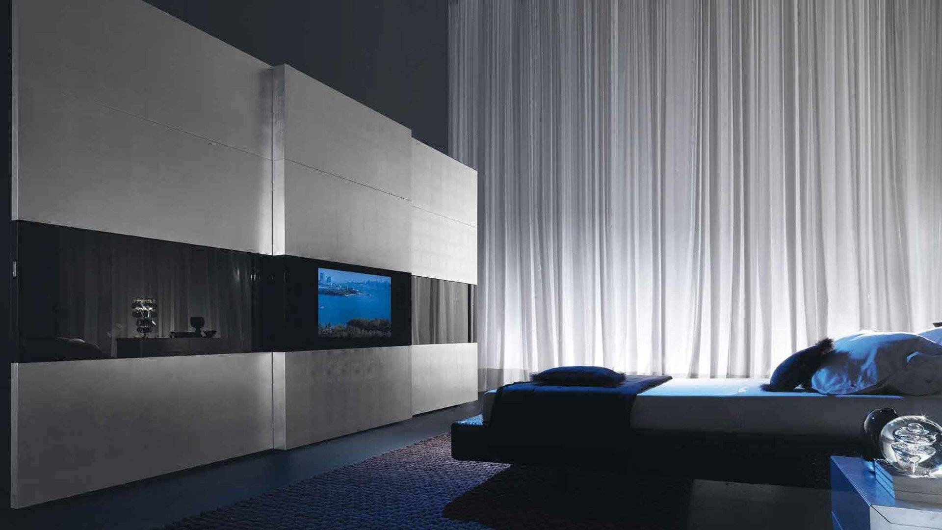Мебель, предназначенная для спальни, порадует не менее продвинутой функциональностью. Небольшие шкафы отличаются хорошей вместительностью. Кровати, несмотря на монолитную конструкцию, часто имеют регулируемое изголовье. Нотку легкости привносят «растущие» из стен полочки, закрепленные при помощи замаскированных кронштейнов.