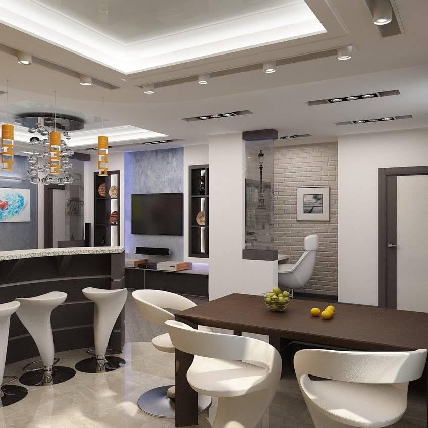 Большую роль конструкция и оформление потолка играют при дизайне гостиной-студии, когда важно одновременно визуально объединить два помещения и провести зонирование. В любом случае, потолочная конструкция должна быть оборудована большим количеством встроенных светильников. При этом, их количество ограничивается только вашей фантазией