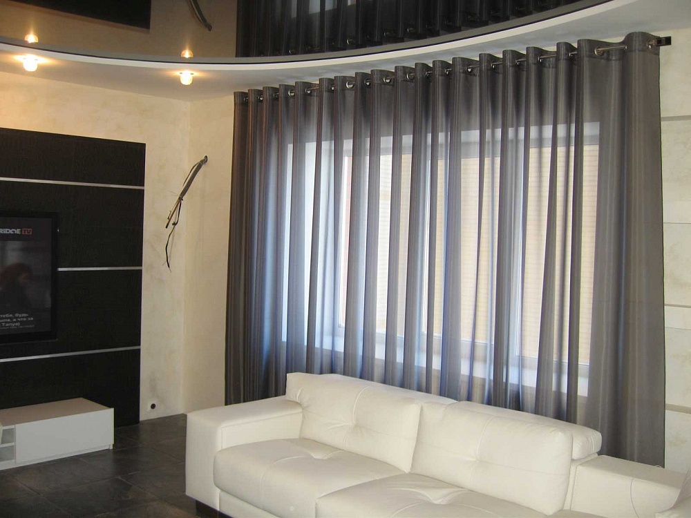 - зал в стиле хай-тек обычно имеет панорамные окна без гардин, это визитная карточка данного направления. Однако при необходимости используйте жалюзи, роллеты, римские шторы или плотные занавески без тюля;
