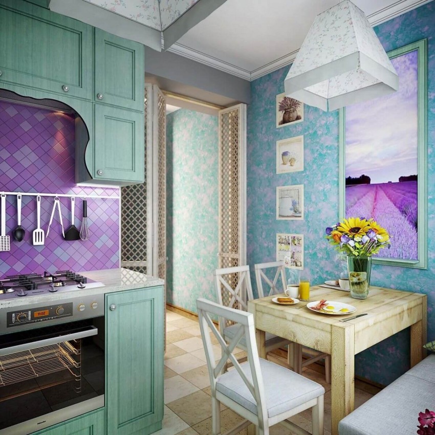 Маленькая кухня – это отличная возможность реализовать мягкий и романтичный стиль интерьера. Здесь чаще всего применяются пастельные оттенки при отделке и покупке мебели: голубой, розовый, лавандовый, оливковый, серый и т.д. Также для прованса характерно умеренное использование декоративных элементов, занавески из натуральных тканей и небольшое количество аксессуаров. Эти детали прекрасно вписываются в любой интерьер.