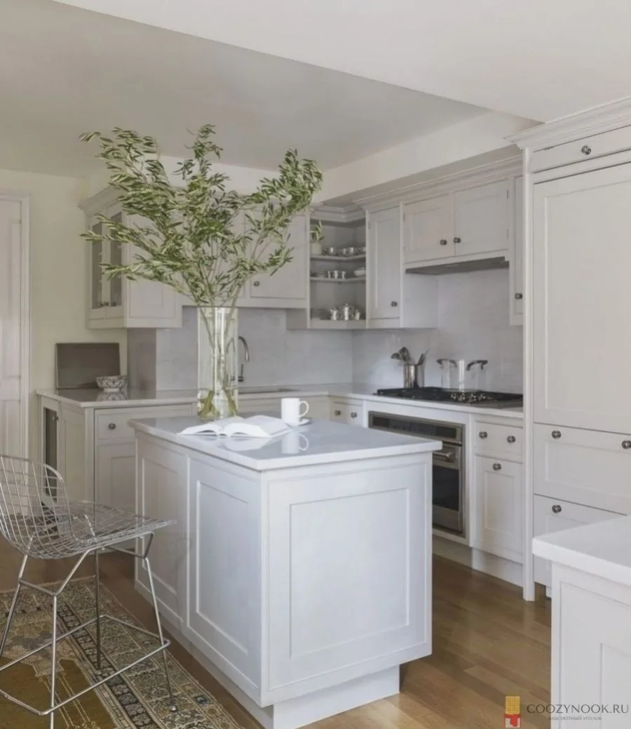 А вот пример монохромной белой маленькой кухни. Холодильник в этой кухне спрятан за шкафом с встроенной духовкой и микроволновкой.