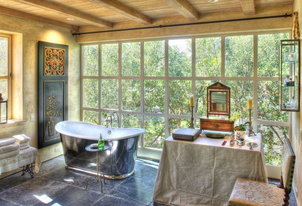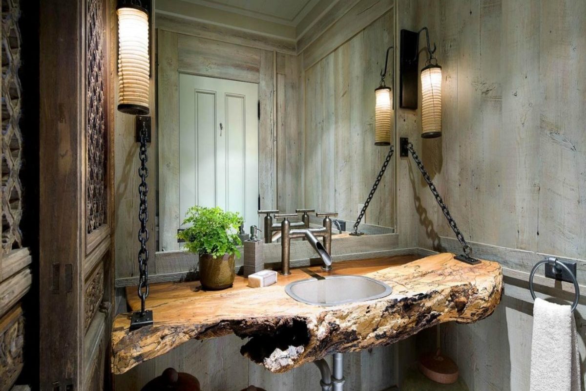 Для декора приобретаются предметы, выполненные в аристократическом стиле. Это могут быть зеркала с необычными рамами, медные смесители, светильники. В обязательном порядке помещение должно содержать винтажные детали, имитирующие старину.