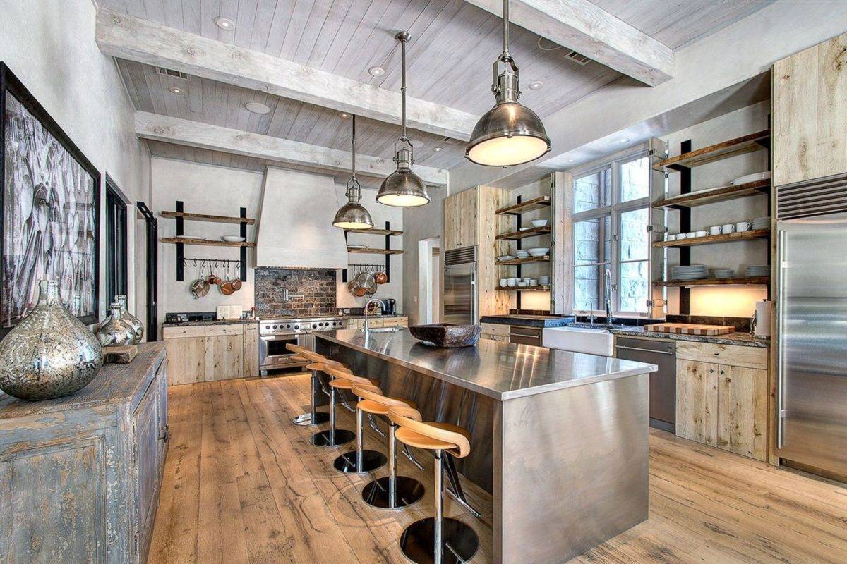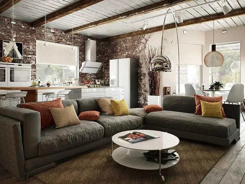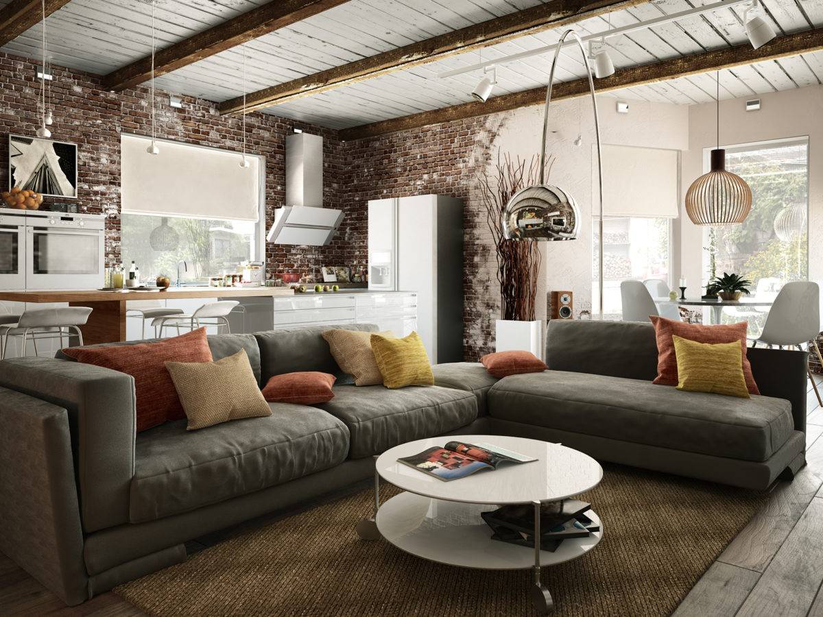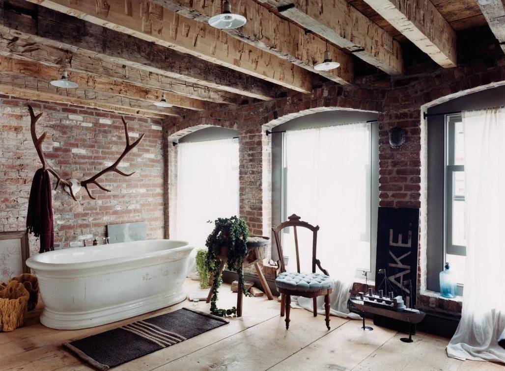 Также при отделке интерьера активно применяются разнообразные приемы состаривания материалов или же их неприкрытая настоящая фактура. К примеру, стены часто декорируют кирпичной кладкой. Если же они сами по себе кирпичные, то их так и оставляют нетронутыми. Для отделки потолка часто применяют натуральное дерево. Иногда для декора применяют доски и балки, которые подвергают грубой шлифовке. Длина и ширина деревянных элементов может быть разной. Таким же материалом можно оформить и стены, но при этом их не окрашивают, чтобы ярко продемонстрировать натуральный цвет и фактуру дерева. А вот для отделки пола можно применять паркет с крупными плашками, плитку и камень.
