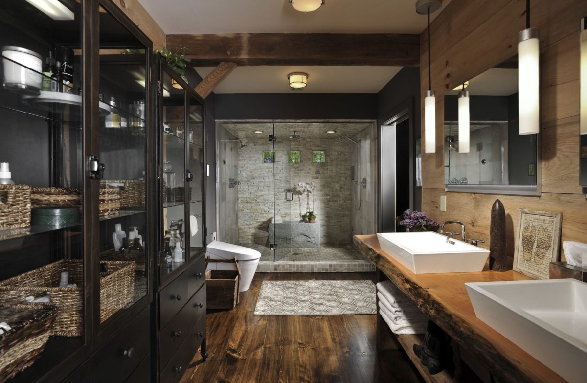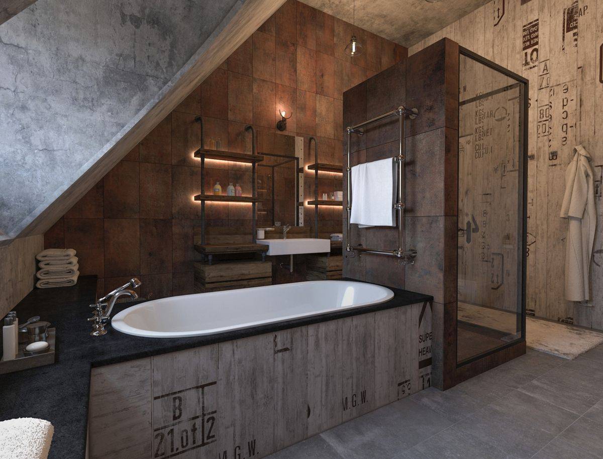 Оформление ванной в подобной стилистике подойдёт как для частных загородных домов и дач, так и для квартир в мегаполисах. Для отделки такого помещения используют плитку серых, чёрных, белых оттенков.