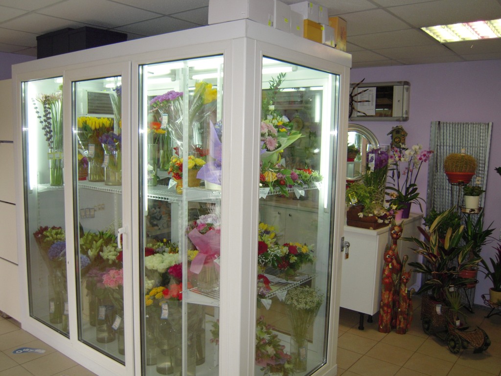 - холодильный шкаф для цветов — он имеет встроенный вентилятор, компрессор и другие элементы, дающие возможность устанавливать оптимальную для цветов температуру. Обычно приобретается шкаф витрина, в котором красиво располагаются все цветы. Такое оборудование оптимально для торговых организаций, специализирующихся на продаже различных цветочных композиций. Дома оно применяется редко;