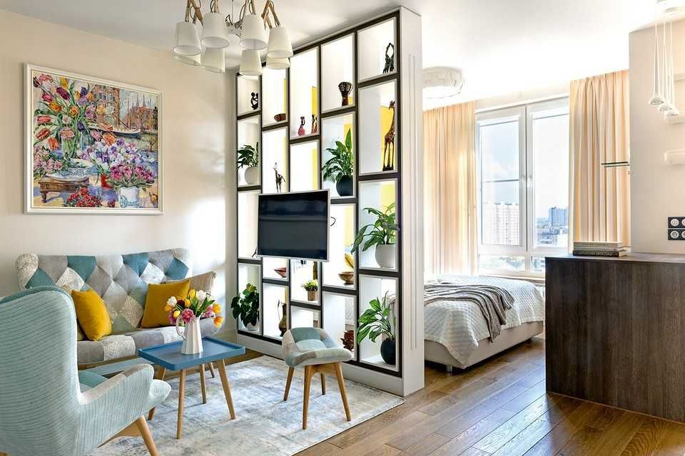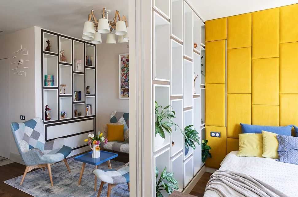 Цвет стеллажа, выполняющего функцию перегородки, может совпадать с цветом стен — в этом случае он воспринимается не как предмет мебели, «выросший» посреди комнаты, а как часть планировки.