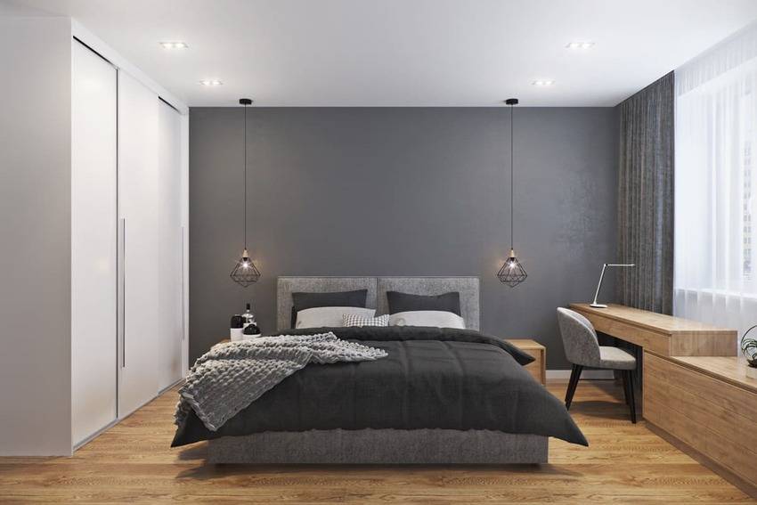 Серые стены в спальне можно сочетать с серыми узорами на ковре, белой мебелью, перегружать спальню такого цвета не нужно.
