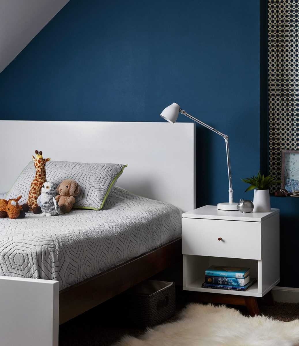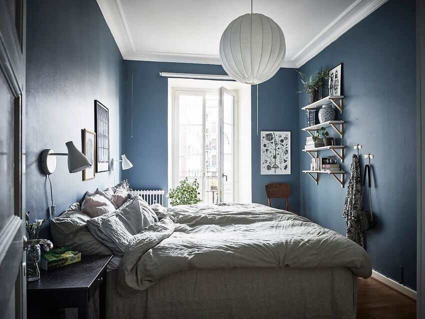 Голубые стены в спальне подходят к темной и светлой мебели, вызывает положительные эмоции, расслабляет и успокаивает. Подходит для солнечных комнат, так как при недостаточном освещении вызывает усталость и слабость.