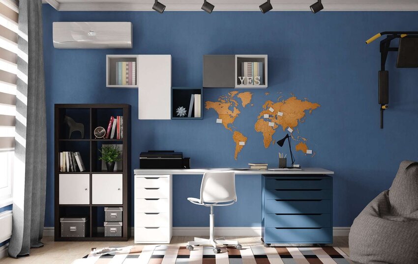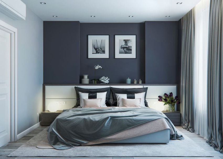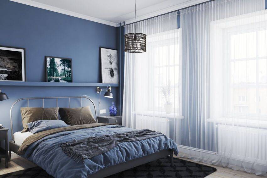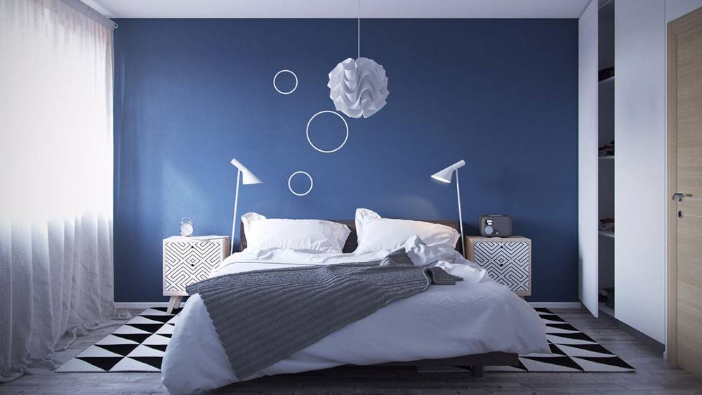 В число универсальных цветовых решений, подходящих как для мужской, так и для женской спальни, можно включить синий цвет: он способствует успокоению и расслаблению, за что ценится всеми без исключения.