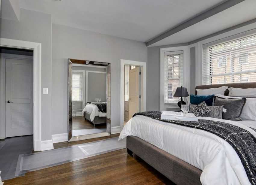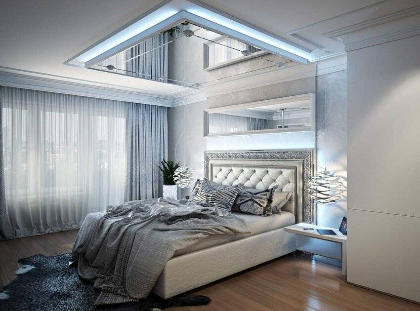 Задекорировать стену над кроватью можно зеркалами. Например, большие зеркальные полотна по обе стороны от изголовья визуально увеличат пространство, придадут спальне более уютный вид.