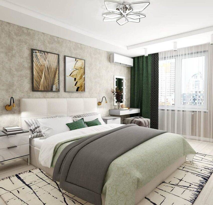 Зеленые стены в спальне подойдут при решении проблем со сном. В этом случае подойдут мягкие оттенки: фисташковый, оливковый. Яркий зеленый можно использовать как акцент, не более. Сочетается с белой мебелью, серым, коричневым, бежевым цветами.
