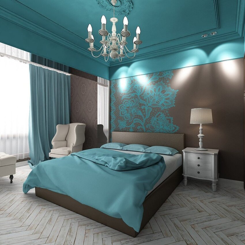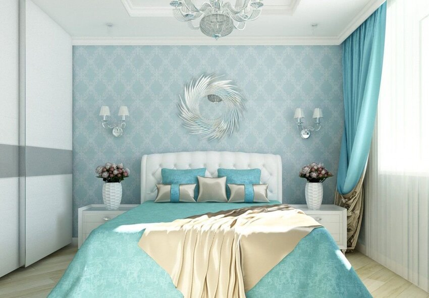 Не менее популярным при отделке спальни становится бирюзовый, добавляющий энергичности и легкости.