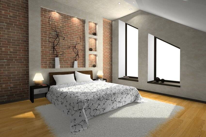 К примеру, кирпичная стена в интерьере спальни подойдет для стиля лофт или прованса. Такая отделка стены над кроватью может выглядеть брутально или романтично, все зависит от выбранной текстуры и цвета кирпича.