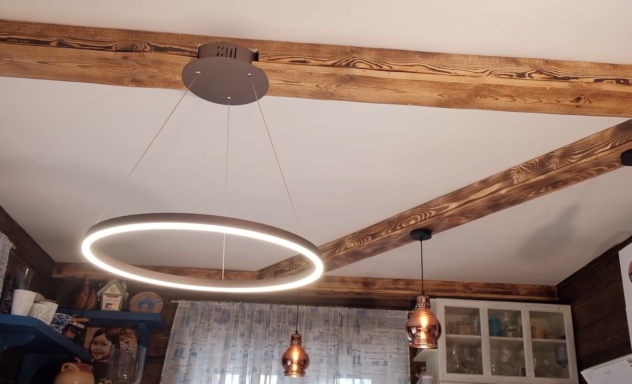 Декоративные балки из бруса на потолке из ГКЛ в деревянном доме выглядят потрясающе