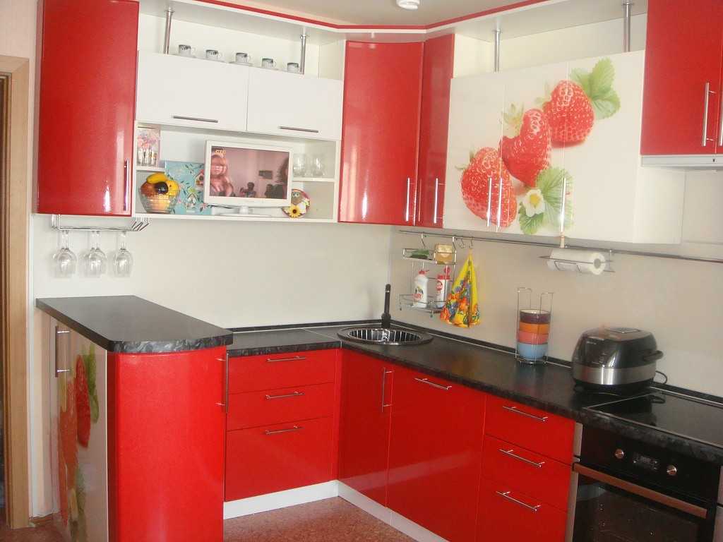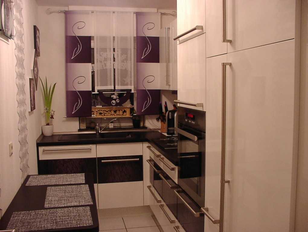 Белая глянцевая мебель наполнит помещение светом, а яркие шторы, столешница из светлого дерева, декор и картины на стенах разбавят монохромность. Только нужно помнить, что излишняя роскошь и помпезность в деталях в маленьком помещении будет выглядеть нелепо. Соблюдайте золотую середину.