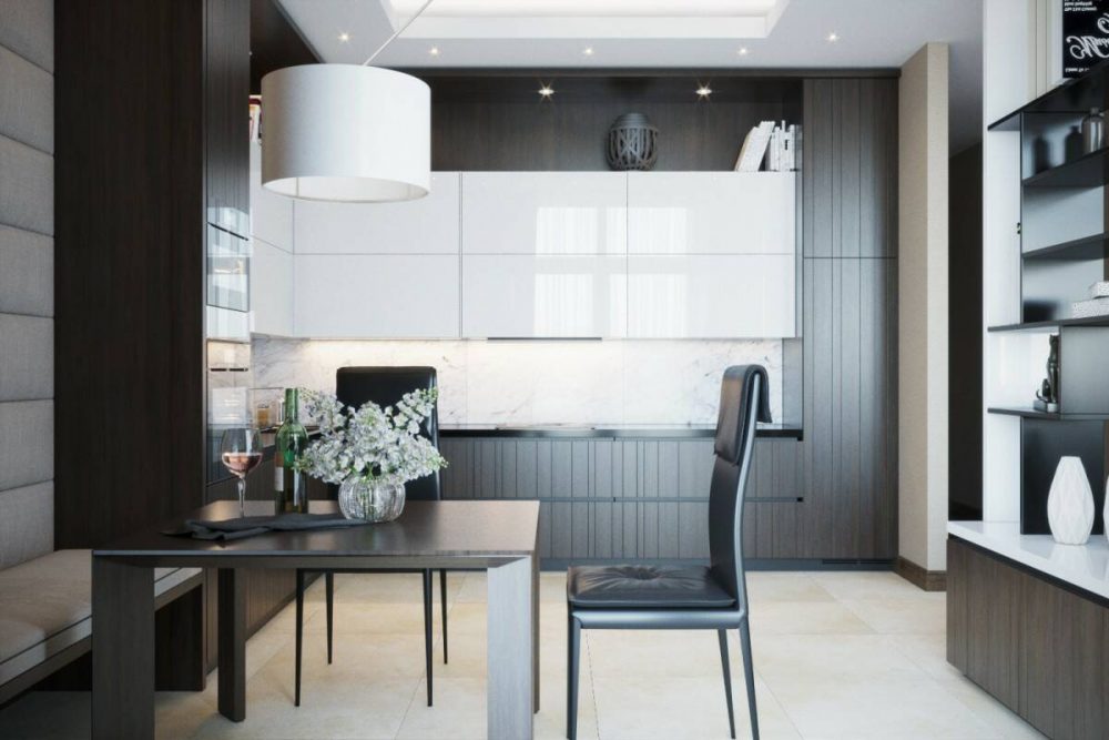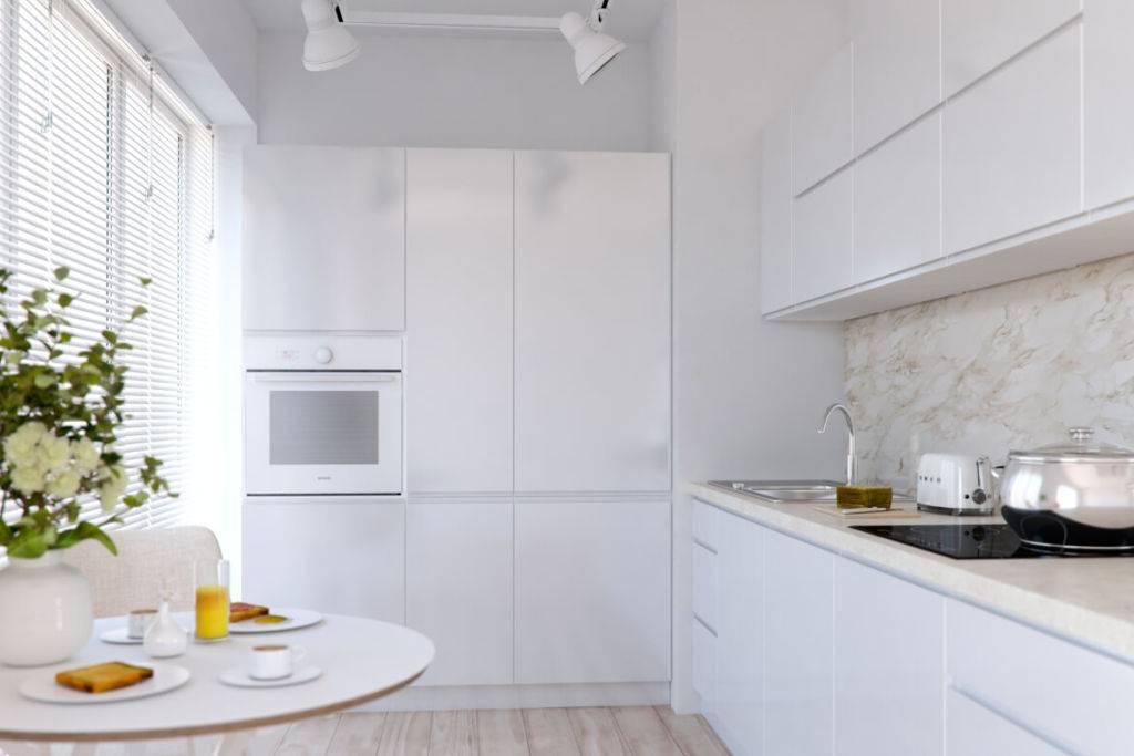Концепция интерьера такого помещения – минимум вещей и много света. Мебель в кухне устанавливают практичную и функциональную. В ней должно быть достаточное количество ниш для хранения. Оптимально, если в гарнитур можно разместить встроенную бытовую технику.