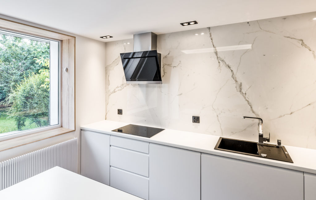 Этот дизайн кухни выглядит изящно. Решение подходит для небольших кухонь, так как сочетает в себе минимализм и практичность.