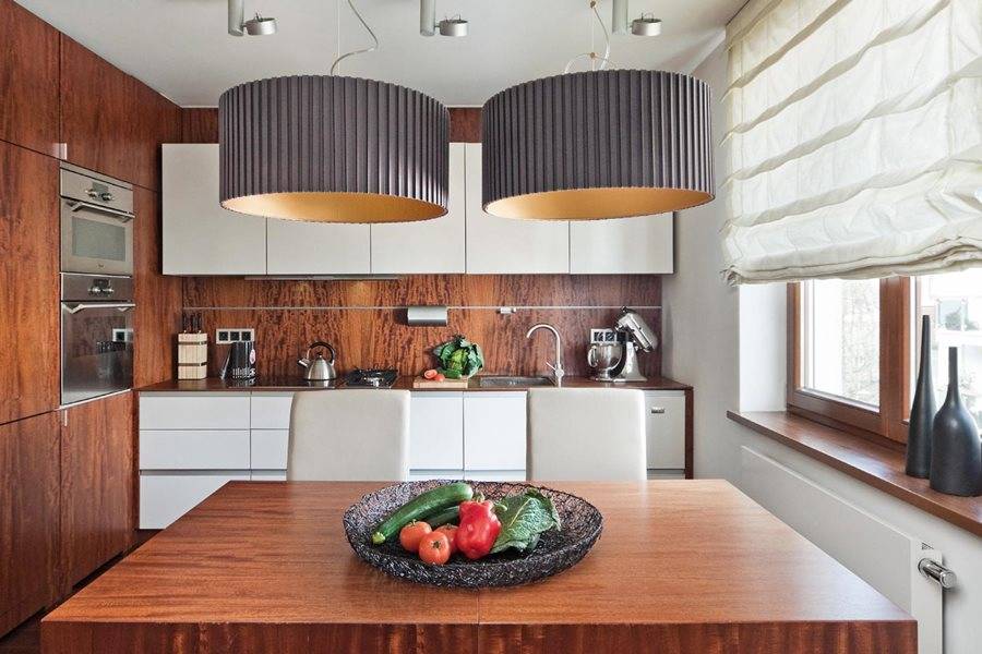 Нередко сегодня, продумывая интерьер кухни 2023 года, дизайнеры предлагают использовать визуальное разделение при помощи освещения. Например, для зоны в гостиной используется центральное освещение, а в рабочей зоне только точечного типа.