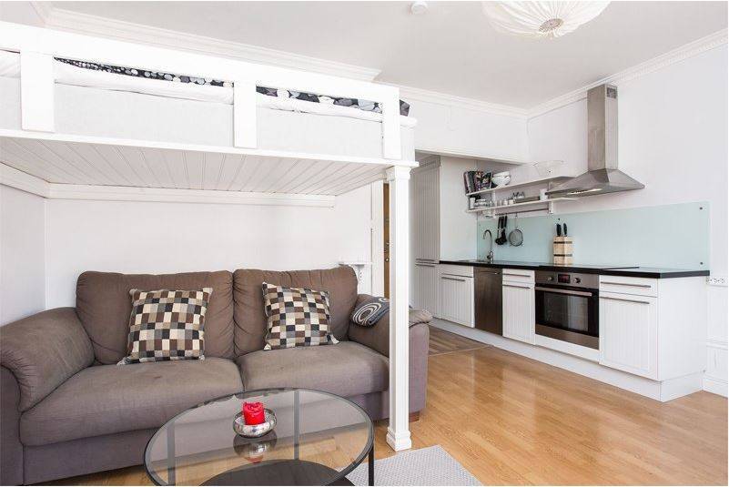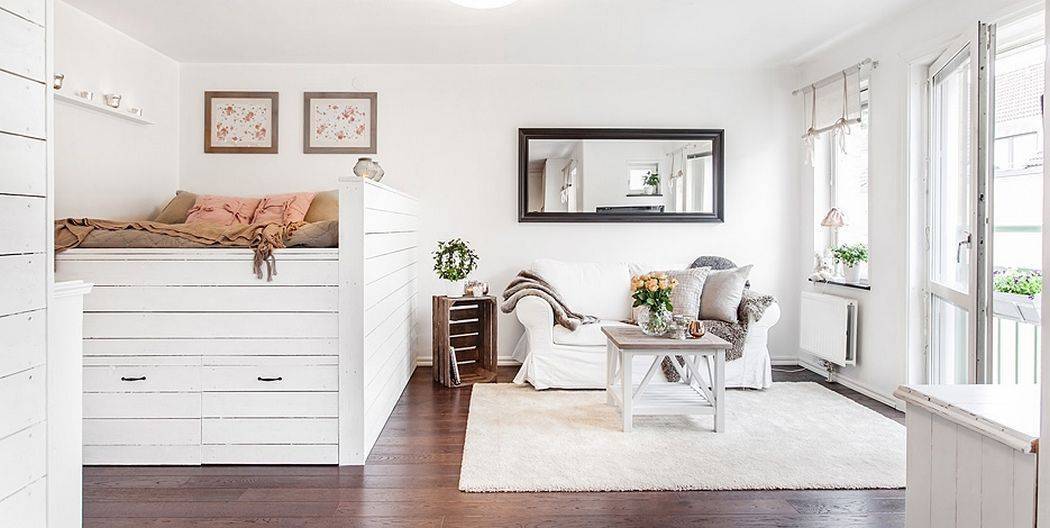 - Спальное место. Диван или кровать-трансформер – очень удобный и экономичный вариант. Это замечательно, если в квартире есть высокий потолок — создайте второй этаж для кровати или обустройте навесной балкончик.