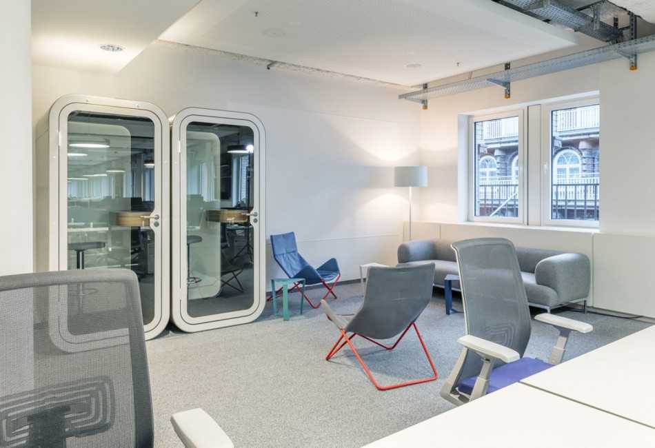 В офисе данной фармацевтической компании предусмотрены яркие изолированные ячейки, рассчитанные на одного человека.