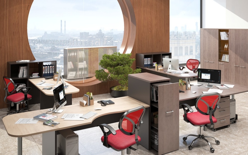 Под рукой у сотрудников должны быть необходимые предметы: тумбы, тумбы и полки. Удобное и доступное расположение офисной мебели обеспечит высокую производительность труда.