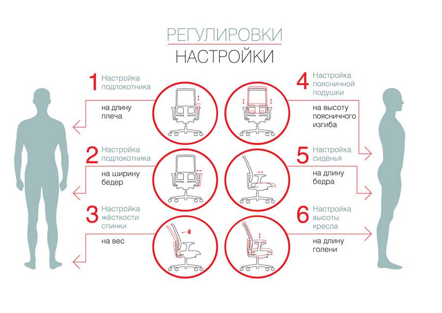 конструкция должна быть подъемно-поворотной с возможностью изменять высоту сидения, угол наклона спинки и некоторые другие параметры