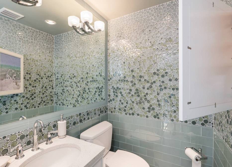 В современном дизайне принято оформлять все комнаты в едином стиле, придерживаясь определённых красок. В интерьер туалета можно внести нотки зелени, если квартира выполнена в пастельных или нейтральных тонах. Травяной цвет можно увидеть на аксессуарах, плитке, отделке потолочного светильника.